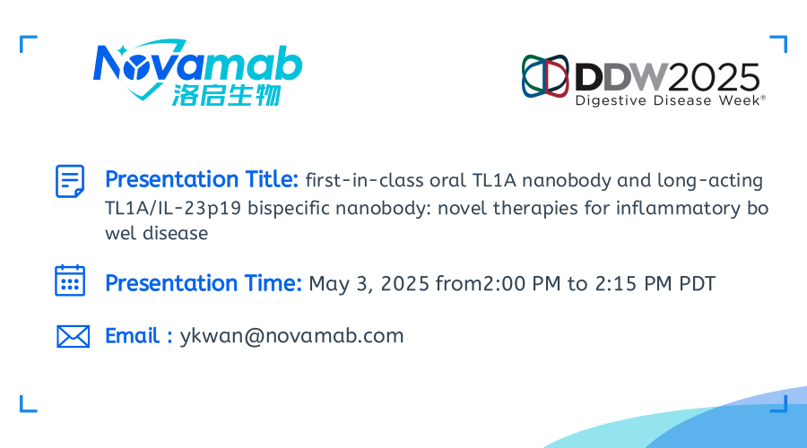 中国上海,2025年4月28日——上海30116金沙js9(中国)生物医药技术有限公司,一家致力于纳米抗体创新药研发的生物技术公司宣布:30116金沙js9(中国)生物将于当地时间5月3-6日参加在加利福尼亚州圣地亚哥举行的2025年美国消化疾病周(Digestive Disease Week,DDW)。届时30116金沙js9(中国)生物将展示在炎症性肠病(IBD)治疗领域的突破性研究成果——口服TL1A纳米抗体及长效TL1A双特异性抗体的开发进展。该创新疗法顺利获得独特的TL1A纳米抗体技术,实现了对IBD病理机制的精准靶向。