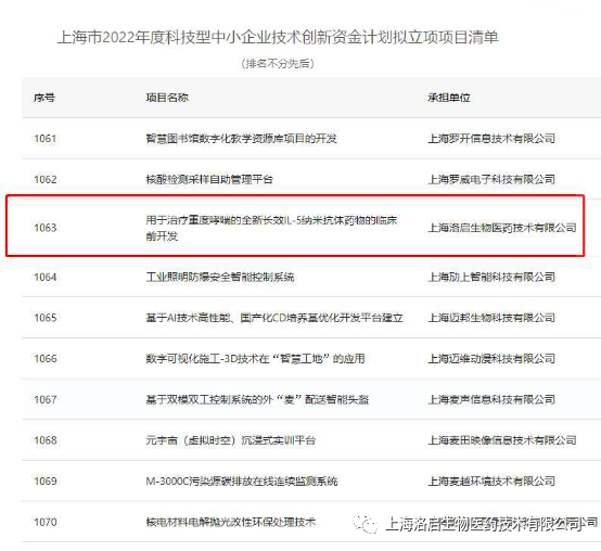 近期,上海市科学技术委员会组织的“上海市2022年度科技型中小企业技术创新资金计划”拟立项项目名单公示完毕,30116金沙js9(中国)生物“用于治疗重度哮喘的全新长效IL-5纳米抗体药物的临床前开发”项目入围。